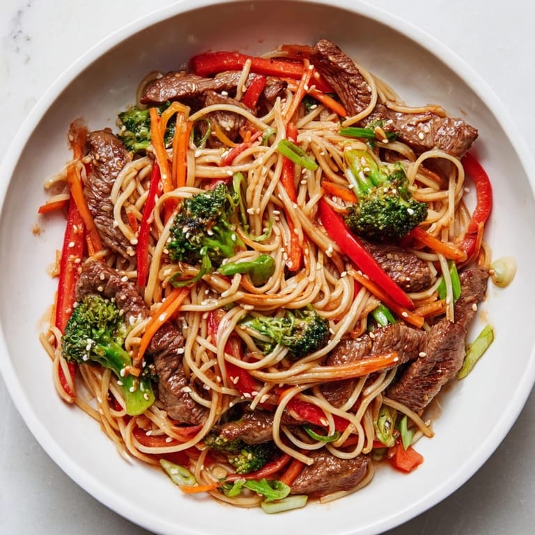 Save Pin A quick and flavorful dish featuring tender beef strips, crisp vegetables, and chewy lo mein noodles tossed in a savory sauce—perfect for busy weeknights.