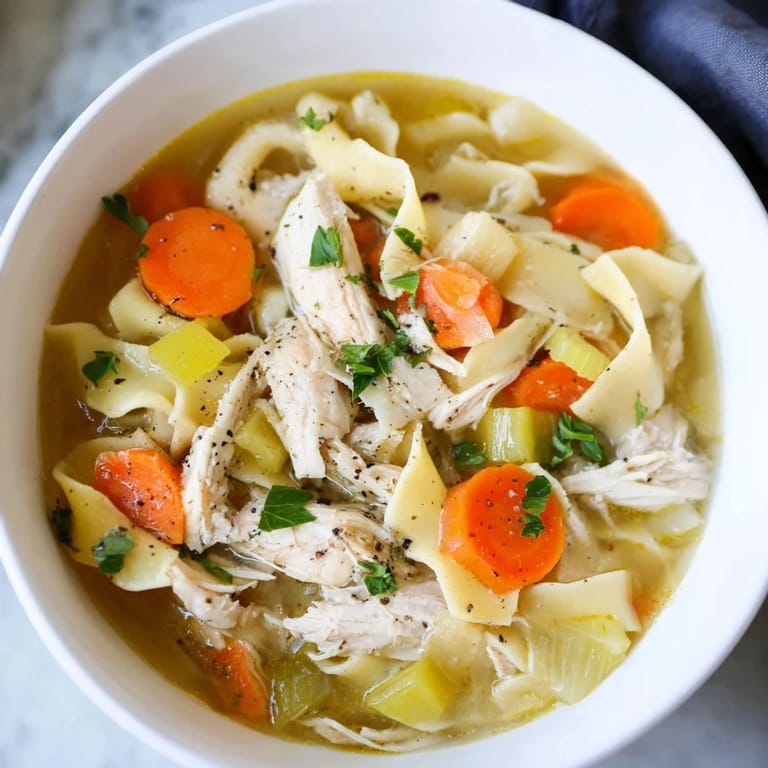 Save Pin A comforting, classic soup featuring tender chicken, hearty vegetables, and egg noodles in a flavorful homemade broth—perfect for chilly days or when you need a nourishing boost.
