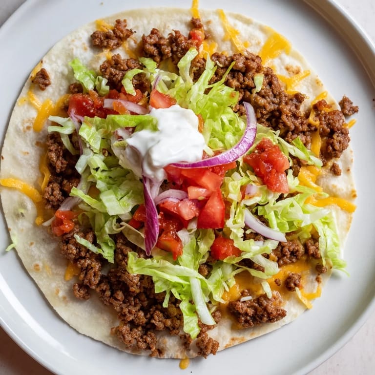 Smashing the beef thin onto the tortilla and cooking on medium-high heat creates a crispy crust on both beef and tortilla edges.