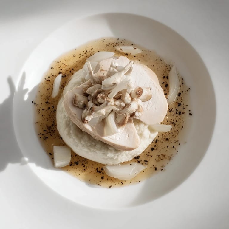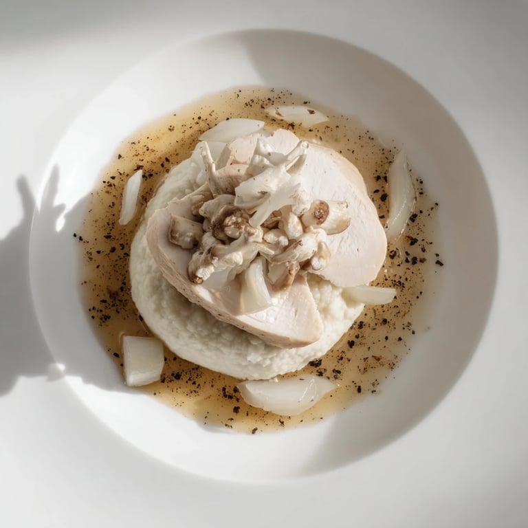 All-white dishes used to feel cold to me, like something served at the kind of restaurant where you're afraid to touch anything. But this one changed my mind because the textures save it—soft chicken, silky purée, tender mushrooms, and that impossible pepper dust that makes you look twice. It's monochromatic without being monotonous, which is harder than it sounds.