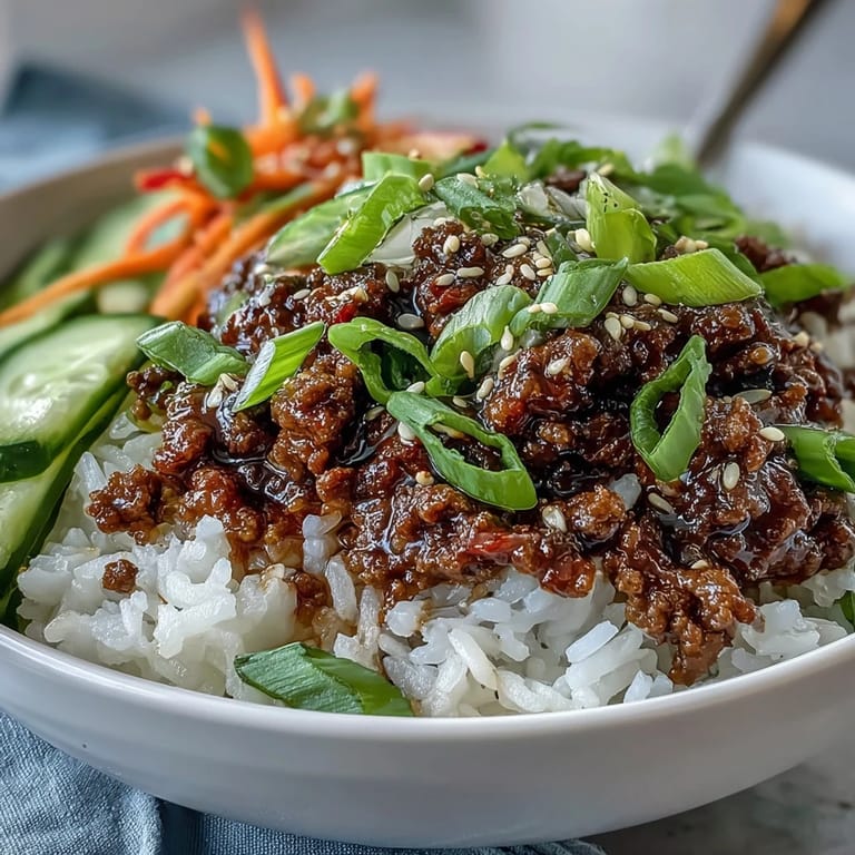 People often overlook the pickled vegetables thinking they're optional garnish, but they're actually the thing that makes your palate reset between bites and keeps the bowl from feeling one-note. The acid cuts through the richness of the beef sauce, the slight sweetness of the vinegar echoes the brown sugar in the meat, and that cool temperature provides relief. You can prep the pickle up to a day ahead and keep it in the fridge, which means you're really just cooking the beef and rice when you're hungry.