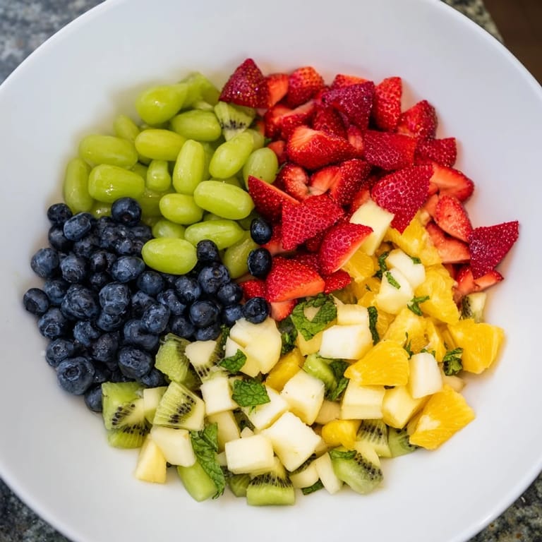 - Fresh Fruits: 2 cups strawberries hulled and quartered 1 cup blueberries 1 cup green grapes halved 1 cup pineapple diced 2 kiwis peeled and sliced 1 orange segmented and cut into bite-sized pieces 1 apple cored and diced (optional toss with a little lime juice to prevent browning)