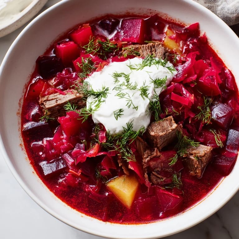 Borscht demands to be served hot in a deep bowl with a generous spoonful of sour cream swirled in just before eating—the cream cools each bite and adds a richness that makes the soup feel almost luxurious. Dark rye bread is the traditional companion, torn into pieces and either dunked into the soup or eaten alongside, and if you can find pampushky (those pillowy Ukrainian garlic rolls), they're worth seeking out. I've also served it alongside simple grilled cheese sandwiches cut into triangles, and that combination somehow feels right for a quiet lunch or a casual dinner.